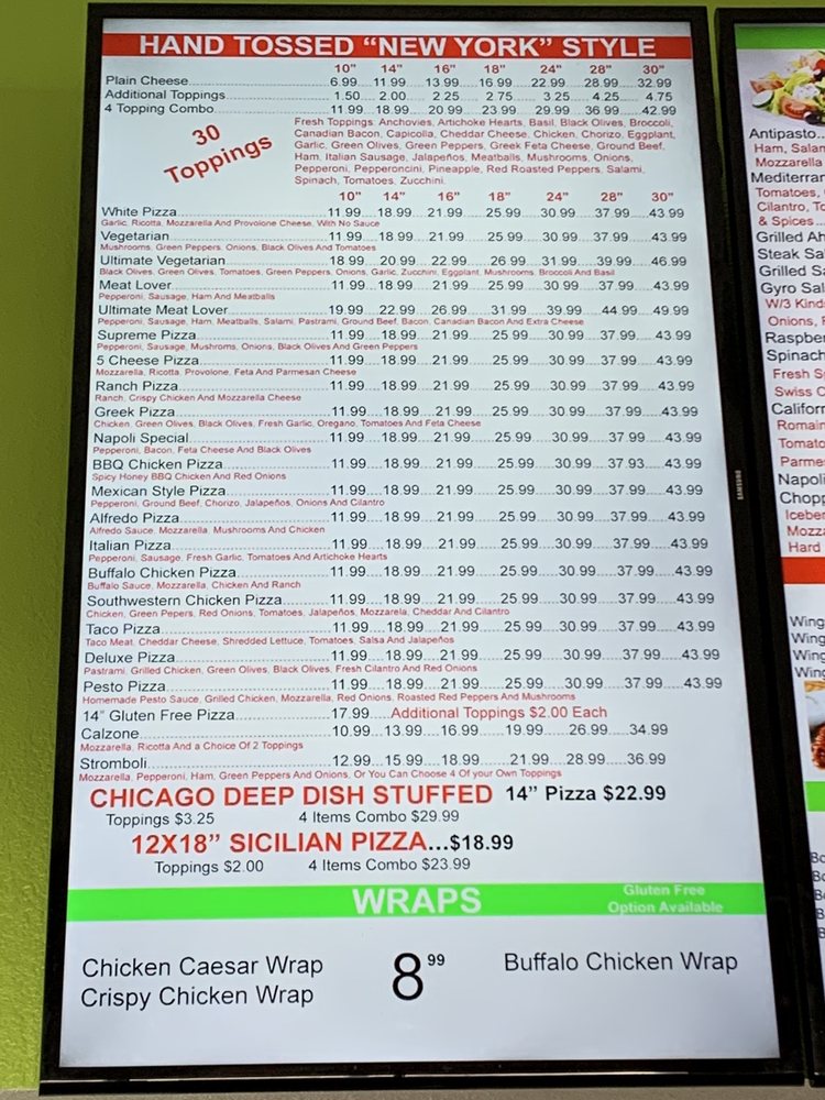 Lunch Specials ANYTIME SPECIALS PIZZA 10" BYO 14" BYO 16" BYO 18" BYO 24" BYO 28" BYO 30" BYO 36" BYO APPETIZERS SALADS WINGS & TENDERS SANDWICHES BURGERS PASTA SIDES DESSERTS BEVERAGES KID'S MENU CATERING MENU Flaming Kebobs Entrees Flaming Kebobs Sandwiches Flaming Kebobs Rotisserie Chicken Flaming Kebobs Salads, Sides, Soups Flaming Kebobs Combos EVERYDAY SPECIALS 10" BUILD YOUR OWN PIZZA 14" PIZZAS 16" PIZZAS 18" PIZZAS 24" PIZZAS 30" PIZZAS SOUPS & SALADS STROMBOLI CALZONES PASTA DINNERS ICE CREAM DRINKS DINNERS MONEY SAVERS Dessert (Catering) Salads (Catering)Half Tray Salads (Catering)Half TrayFull Tray